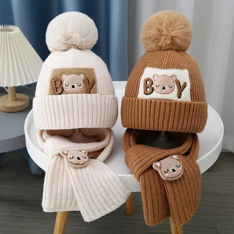 2Pcs/Set Children's Hat and Scarf Set for Boys and Girls Winter Warmth Cotton Lining Wool Knit Hats Baby Two-Piece Hat Set