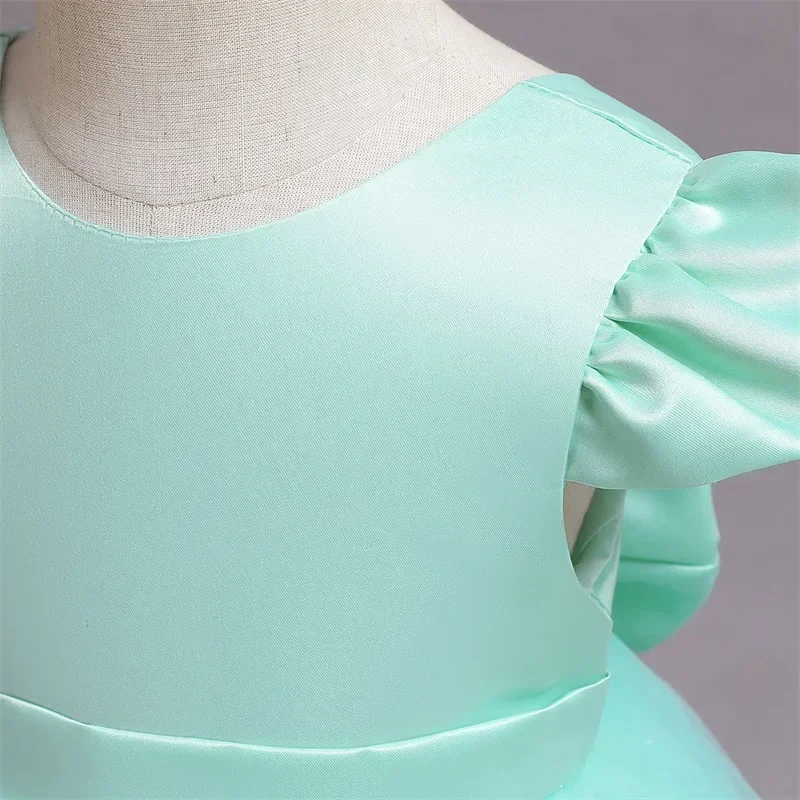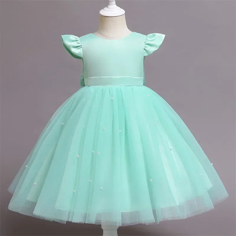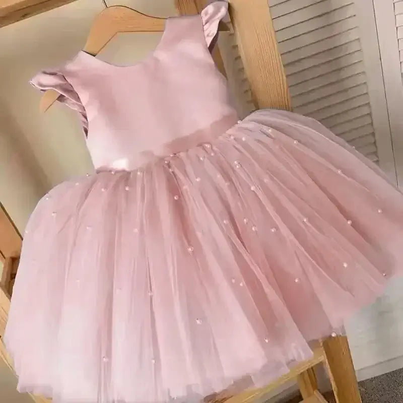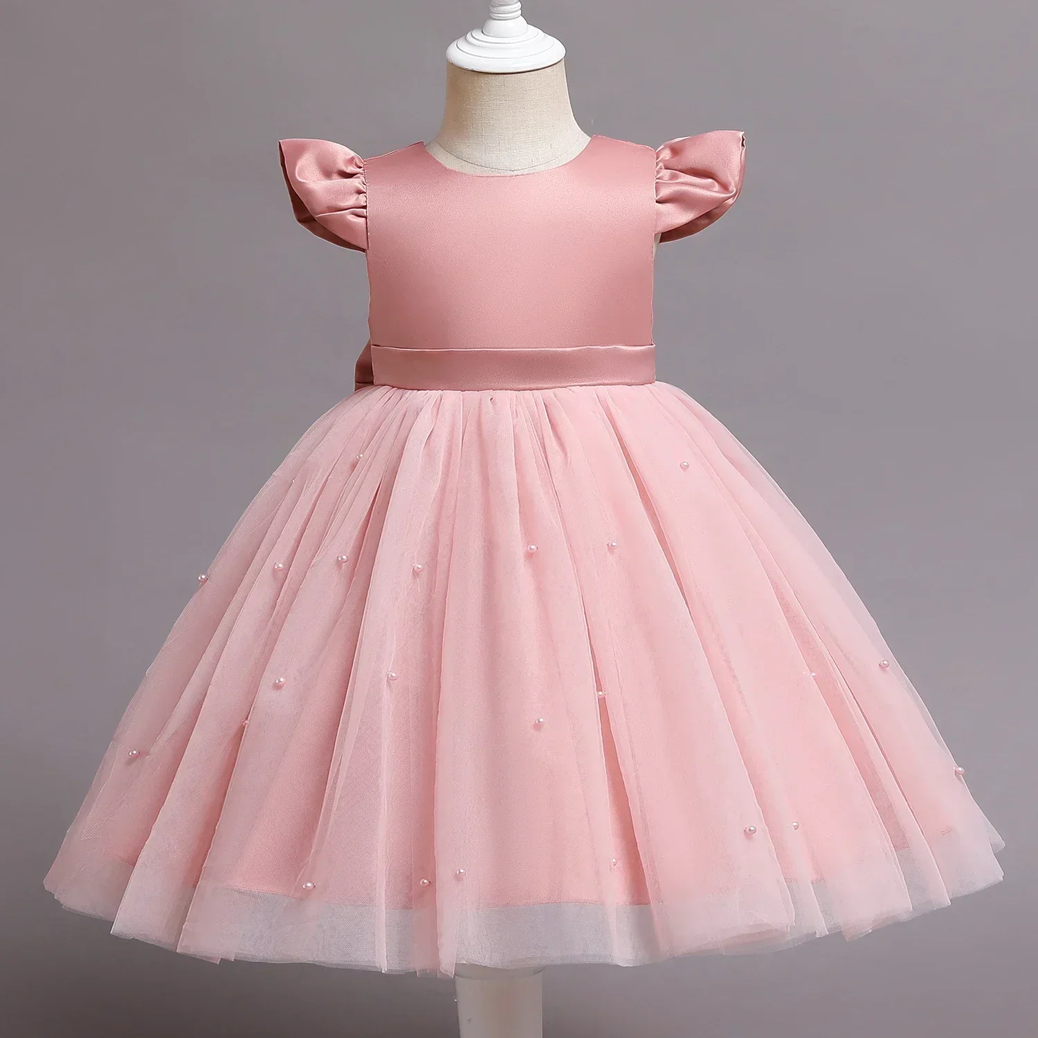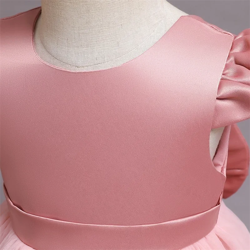 Pink Flower Girl Dresses Cute Bow Short Sleeve Princess Dresses for Formal Wedding Kid Birthday Party Banquet Elegant Girls Gown